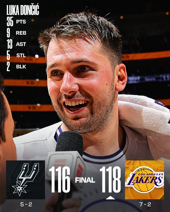 Luka Doncic rozó el triple-doble con 35 puntos, 13 asistencias, 9 rebotes y 5 robos para sostener el quinto triunfo seguido de los Lakers. Deandre Ayton sumó 22 y 10 rebotes. Victor Wembanyama tuvo 19 y 8 antes de salir por faltas, en una caída agónica para San Antonio.