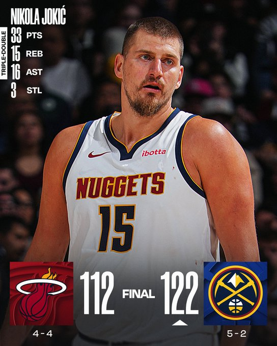 Nikola Jokic volvió a brillar con un triple-doble de 33 puntos, 16 asistencias y 15 rebotes en la 11ª victoria seguida de Denver sobre Miami. Aaron Gordon acompañó con 24 tantos. En el Heat, Norman Powell anotó 23, pero Bam Adebayo salió lesionado en el primer cuarto. Los Nuggets tiraron un 56% de campo y dominaron de principio a fin.