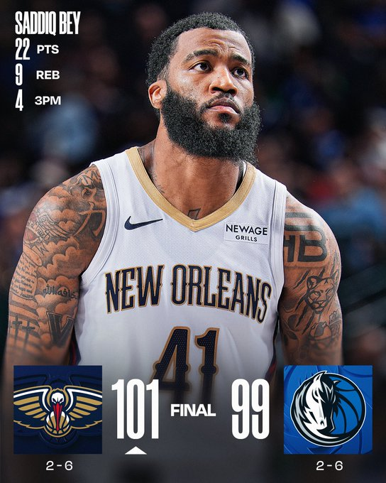 Saddiq Bey fue clave con 22 puntos y 9 rebotes para que los Pelicans se impongan en el cierre. Jose Alvarado y Jeremiah Fears acompañaron con 13 cada uno. En Dallas, el novato Cooper Flagg firmó 20 puntos y 9 rebotes, mientras Klay Thompson aportó 11 desde el banco. Un doble de Bey a falta de 4 segundos selló el triunfo en Texas.