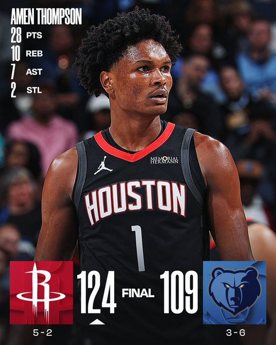 Amen Thompson firmó 28 puntos, 10 rebotes y 7 asistencias en el quinto triunfo seguido de Houston. Alperen Sengun dominó con 20 y 16 rebotes, mientras que Jabari Smith Jr. y Tari Eason anotaron 16 cada uno. Memphis sufrió su cuarta caída al hilo pese a los 19 puntos de Cam Spencer. Los Rockets anotaron 72 puntos en la pintura y jugaron su mejor baloncesto colectivo del mes.