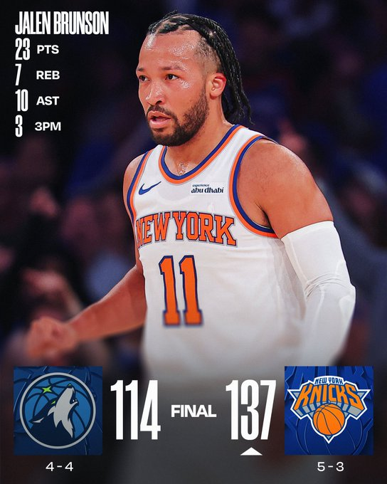 OG Anunoby (25) y Jalen Brunson (23 puntos, 10 asistencias, 7 rebotes) comandaron la paliza de los Knicks ante el regreso de Anthony Edwards, que sumó 15 tras cuatro juegos ausente. Julius Randle aportó 32 y Donte DiVincenzo agregó 21 para un Garden invicto. Los Knicks superaron los 70 puntos en la primera mitad y no miraron atrás.