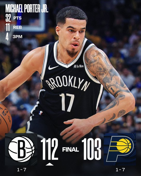 Michael Porter Jr. comandó la primera victoria de los Nets con 32 puntos y 11 rebotes en Indiana. Brooklyn sobrevivió a la baja de Cam Thomas, que salió por una molestia en el isquiotibial, y tuvo a Nic Claxton (18) y Noah Clowney (17) como apoyos claves. Pascal Siakam lideró a los Pacers con 23 puntos y 9 asistencias. Los Nets cerraron con una defensa firme que dejó a Indiana sin puntos por casi tres minutos.