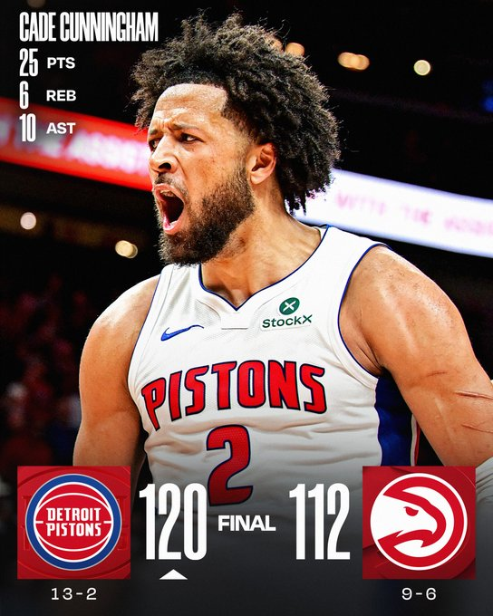 Detroit sigue demostrando su impresionante nivel y, en esta oportunidad, se impuso ante Atlanta Hawks por 120 a 112. Cade Cunningham fue la figura del encuentro y aportó 25 puntos, 10 asistencias y 6 rebotes en el elenco de la Ciudad del Motor. Del otro lado fue clave Jalen Johnson, también con 25 unidades.