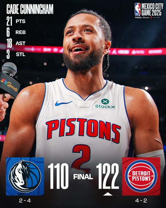 Los Pistons de Detroit lograron una victoria por 122-110 sobre los Mavericks de Dallas en un partido jugado el sábado por la noche en la Ciudad de México. Este fue el primer juego fuera de casa para Dallas en la temporada, pero el equipo tuvo que enfrentarlo sin dos de sus principales figuras, Kyrie Irving y Anthony Davis, además del pívot titular Dereck Lively II. Por su parte, Daniel Gafford hizo su debut de temporada después de recuperarse de una lesión en el tobillo. D’Angelo Russell lideró a los Mavericks con 31 puntos, pero siete pérdidas en el último cuarto permitieron a los Pistons despegar en los minutos finales