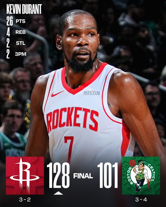 Con 26 puntis de Kevin Durant y 17 de Amen Thompson (sumó también 9 rebotes y 8 asistencias), más 16 unidades, 10 rebotes y 9 asistencias de Alperen Sengun, Houston festejó por 128 a 101 ante Boston. Los Celtics, que cortaron una buena racha, tuvieron 17 puntos de Baylor Scheierman y 14 de Payton Pritchard ante un controlado Jaylen Brown (12 puntos).