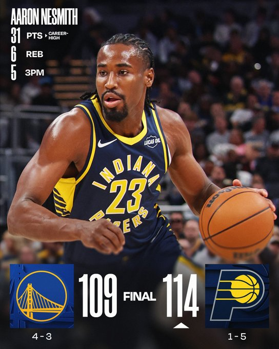 Finalmente llegó el esperado triunfo de Indiana en la temporada. El subcampeón de la NBA logró una gran victoria por 114 a 109 ante los Warriors gracias a 31 puntos de Aaron Nesmith, a 27 de Pascal Siakam y a 25 más 10 asistencias de Quenton Jackson. Lo mejor de Golden State pasó por los 24 puntos de Steph Curry y los 20 de Jimmy Butler.