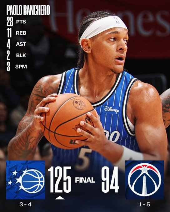 Orlando dominó a Washington y venció sin problemas por 125 a 94 como visitante. Paolo Banchero fue la gran figura con 28 puntos y 11 rebotes, seguido por 25 unidades de Franz Wagner. En los Wizards lo mejor se vio en los 17 puntos de Kyshawn George.