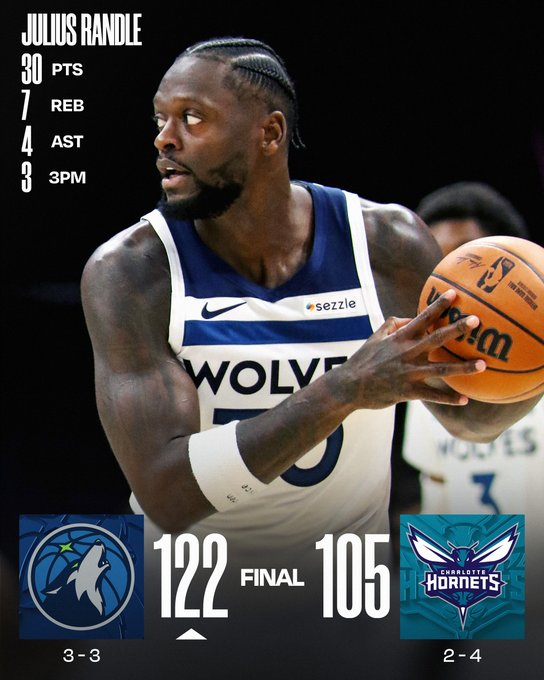Julius Randle emergió ante la ausencia de Anthony Edwards para anotar 30 puntos y llevar a los Timberwolves a la victoria por 122 a 105 ante los Hornets. Lo acompañaron Naz Reid y Donte DiVincenzo con 18 puntos y Rudy Gobert, autor de 14 puntos y 15 rebotes.