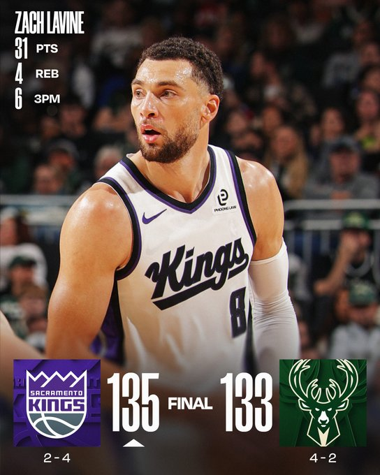 Los Kings se llevaron un gran juego en Milwaukee por 135 a 133. Sacramento no falló desde la línea en el cierre y tuvo grandes defensas finales para llevarse la victoria con 31 puntos de Zach LaVine, 29 de Demar DeRozan, 24 más 13 rebotes de Domantas Sabonis y 24 más 7 asistencias de Dennis Schroder. Los 26 puntos de Giannis Antetokounmpo fueron lo más destacado de los Bucks.