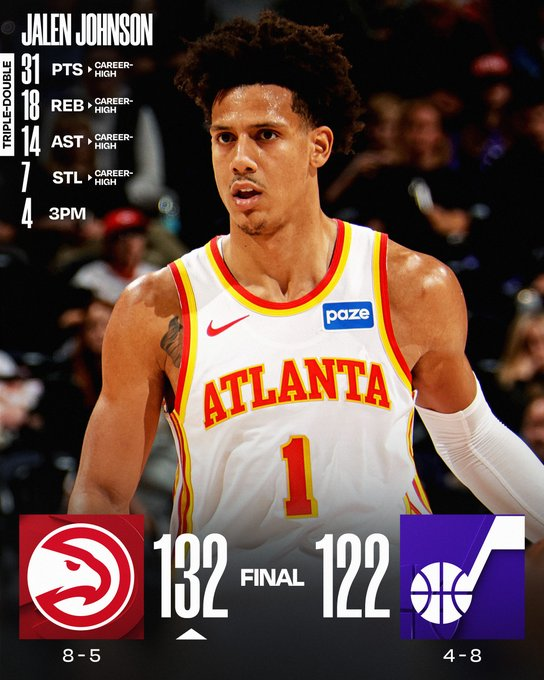 Finalmente cerramos esta corta jornada con lo que fue la gran victoria de Atlanta Hawks en casa de Utah por 132 a 122. El elenco rojiblanco festejó en Salt Lake City gracias a un impresionante partido de Jalen Johnson, que sumó 31 puntos, 18 rebotes y 14 asistencias, quedando a 3 robos del cuádruple-doble. Del otro lado sobresalió Lauri Markkanen, el goleador de la jornada, con 40 puntos y 7 recobres.