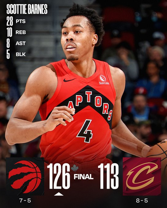 El primer juego de la jornada de jueves tuvo la gran victoria fuera de casa de los Toronto Raptors. El equipo canadiense logró imponerse ante unos duros Cavaliers por 126 a 113 para llegar a su séptima victoria en la temporada. El mejor de la cancha fue Scottie Barnes, que aportó 28 puntos, 10 rebotes y 8 asistencias. Por el lado de los Cavs sobresalió Donovan Mitchell, que metió 31 tantos.