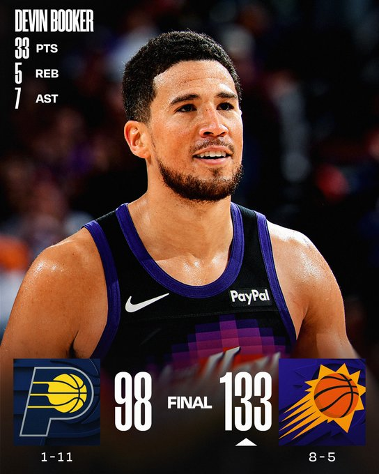 Los Pacers no pueden hacer pie en este inicio de temporada. Las lesiones se hacen notar partido tras partido y ahora volvieron a caer para llegar a un récord de una victoria y 11 derrotas. En esta oportunidad cayeron ante los Suns por 133 a 98. Devin Booker fue el mejor de los de Arizona, aportando 33 tantos, 7 asistencias y 5 recobres.