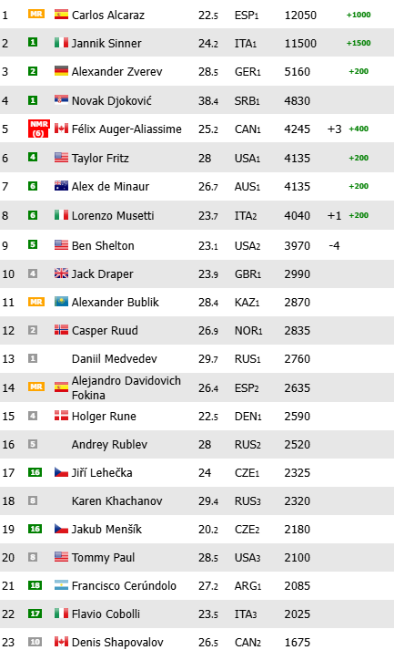 En el Top 10 de fin de año, hay dos italianos (Sinner y Musetti) y dos estadounidenses (Taylor Fritz y Shelton). Es apenas la segunda vez que hay dos italianos en la misma temporada, tras Matteo Berrettini y Sinner en 2021.