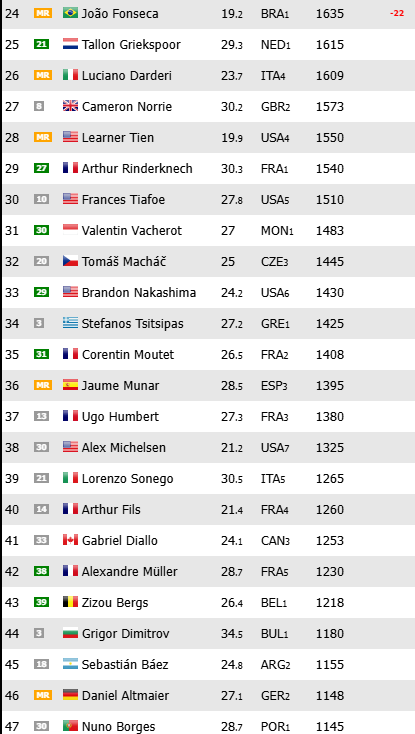Doce jugadores ascendieron al menos 100 puestos para finalizar entre los 100 mejores del año: Joao Fonseca (+121), Valentin Vacherot (+109), Reilly Opelka (+243), Valentin Royer (+128), Ethan Quinn (+133), Marin Cilic (+105), Filip Misolic (+242), Emilio Nava (+125), Pablo Carreño Busta (+108), Dalibor Svrcina (+135), Eliot Spizzirri (+137) y Shintaro Mochizuki (+140).