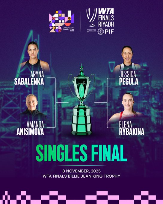 De esta manera, las semifinales del certamen ya tienen definidas a sus protagonistas: -Aryna Sabalenka (1ª Grupo Steffi Graf) enfrentará a Amanda Anisimova, segunda del Grupo Serena Williams.
