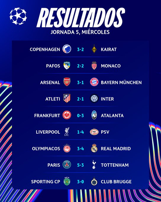 Resumen del martes de la jornada 6 que vio ganar además a Liverpool, Mónaco, Atalanta, Olympiacos, Marseille, Tottenham y Bayern München