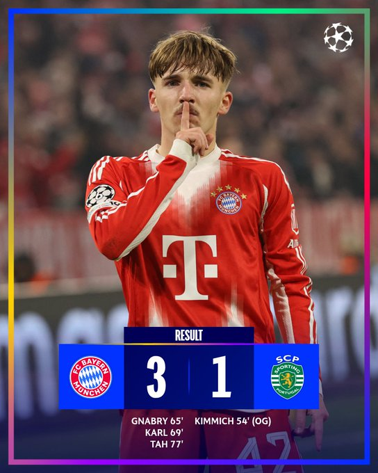 Los goles de Serge Gnabry, Lennart Karl y Jonathan Tah sellaron la quinta victoria del Bayern esta temporada, tras remontar ante el Sporting.