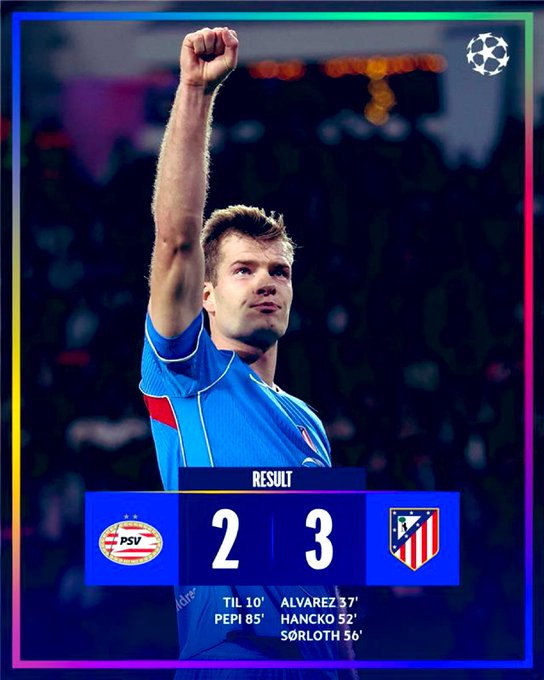 El conjunto español mantuvo el impulso y se adelantó en la segunda mitad por mediación de Hancko, que aprovechó el rechace de Kovář al lejano disparo de Nahuel Molina para anotar el 1-2. Poco después, una gran acción combinativa de los visitantes entre Julián Alvarez, Pablo Barrios y Sørloth generó el tercero, con el ariete noruego definiendo la jugada rematando de cabeza. En el tramo final, el PSV recortó distancias con el gol de Pepi a la salida de un córner y tuvo el empate en las botas de Obispo, pero los de Simeone sumaron tres valiosos puntos. Jugador del Partido: Alexander Sørloth (Atlético de Madrid)
