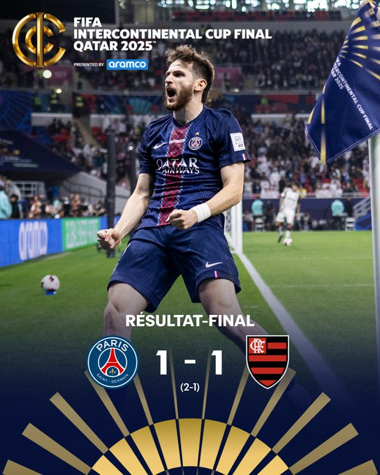El París Saint-Germain francés venció hoy al Flamengo brasileño en penales en la final de la Copa Intercontinental de fútbol. Los 90 minutos reglamentarios mostraron empate 1-1, por los tantos del georgiano Khvicha Kvaratskhelia para los campeones de Europa en el minuto 38, y del italo-brasileño Jorginho al 62, de penal, por los titulares de la Copa Libertadores de América.