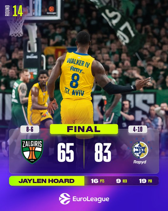 Walker terminó con 23 puntos, Jaylen Hoard anotó 16 puntos y 9 rebotes e Iffe Lundberg añadió 10 puntos para los ganadores. Sylvain Francisco lideró al Zalgiris con 13 puntos y 7 asistencias, pero se quedó en 0 de 7 triples, poniendo fin a una racha de 35 partidos consecutivos con un triple anotado. El Zalgiris perdió su segundo partido en casa de la temporada, cayendo a 8-6, mientras que el Maccabi consiguió su segunda victoria a domicilio, escalando a 4-10.