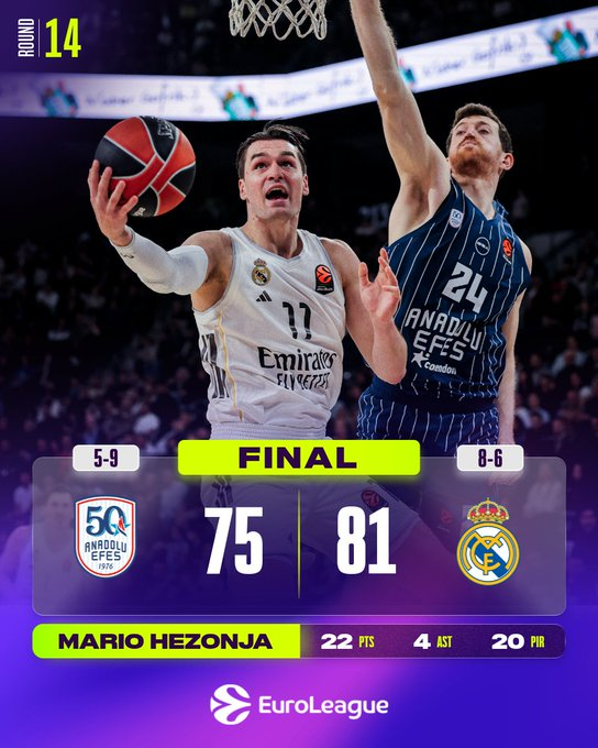 En un duelo físico que se definió en los últimos dos minutos, el Real Madrid consiguió su tercera victoria consecutiva al vencer al Anadolu Efes Estambul por 75-81 a domicilio en la jornada 14 el jueves. El Real Madrid mejoró su marca a 8-6 en la clasificación, mientras que el Efes bajó a 5-9. El Efes ganaba 67-65 a 7 minutos del final, pero el Real Madrid se consolidó en defensa, con un parcial de 5-16 para conseguir otra victoria. Mario Hezonja lideró a los ganadores con 22 puntos. Trey Lyles añadió 11, mientras que Chuma Okeke anotó 10, todos en el tercer cuarto, para el Real.