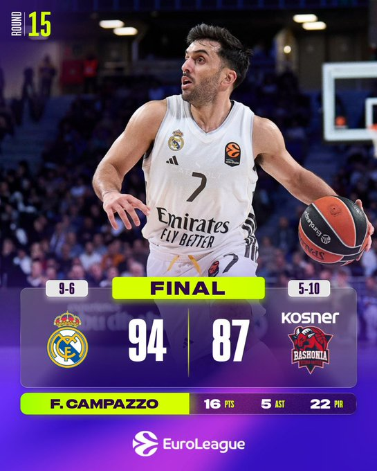 El Real Madrid logró su cuarta victoria consecutiva, mejoró su balance a 9-6 y se mantuvo en el camino hacia la postemporada con una emocionante victoria en casa por 94-87 ante el Baskonia, que bajó su balance a 5-10.