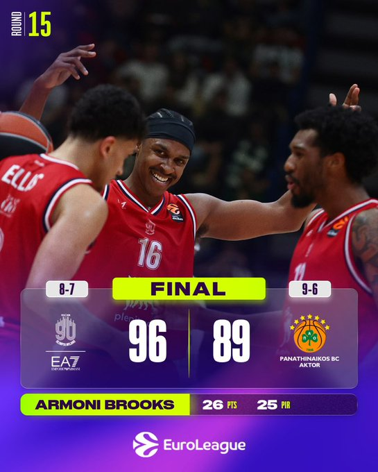 El Milán volvió a la senda del triunfo al derrotar al Panathinaikos por 96-89 el jueves por la noche en el Unipol Forum. Un parcial de 0-14 permitió a los visitantes tomar una ventaja de 21-26 tras 10 minutos. Pero el Milán respondió con una racha de 15-2 en el segundo cuarto, cuando Armoni Brooks brilló desde la línea de tres puntos para establecer una ventaja de 54-44 al descanso.