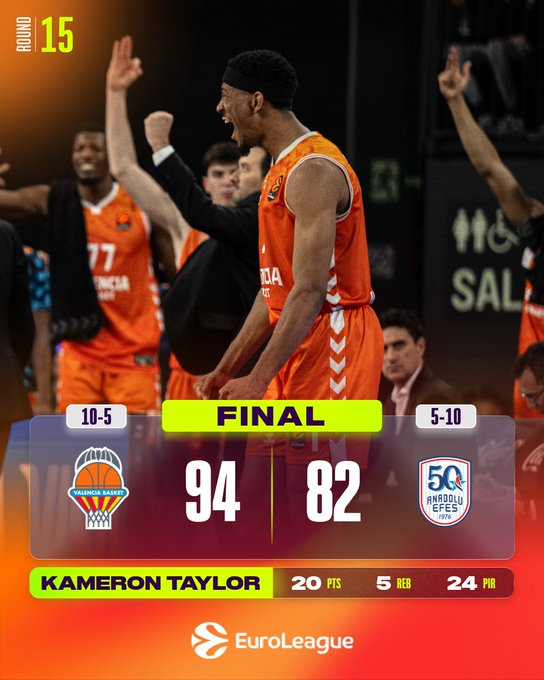 El Valencia logró su cuarta victoria consecutiva al vencer al Efes por 94-82 en el Roig Arena en la jornada 15 el jueves. El Valencia mejoró su marca a 10-5 en la clasificación, mientras que el Efes bajó a 5-10 y acumula una racha de tres derrotas consecutivas.