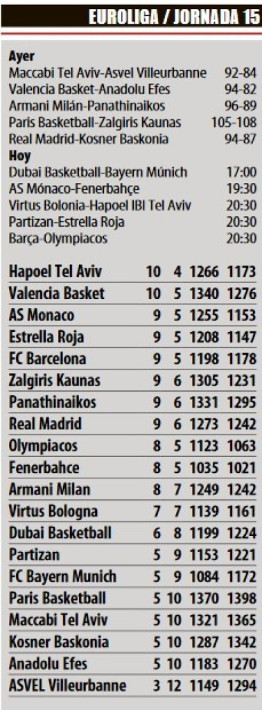 El Valencia sigue al rojo vivo, Real Madrid vence en duelo español al Baskonia, el Milan derrota al PAO, triunfo del Maccabi Rapyd en casa. Este viernes sigue una serie de cinco partidos.