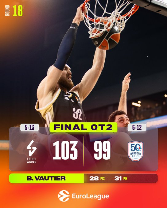 En un emocionante partido con doble prórroga, el ASVEL superó al visitante Anadolu Efes por 103-99 el martes por la noche. El ASVEL mejoró su marca a 5-13 en la temporada, registrando su quinta victoria en casa en ocho partidos, mientras que el Efes bajó a 6-12 y ha perdido dos de tres partidos con el nuevo entrenador Pablo Laso.