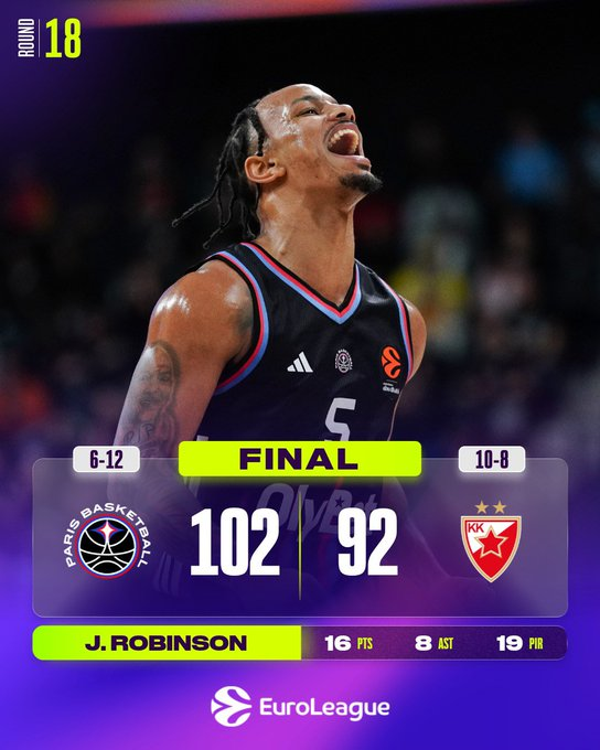 Cinco anotadores del Paris terminaron en dobles dígitos, liderados por Justin Robinson con 16 puntos. Nadir Hifi añadió 15 puntos y Lamar Stevens aportó 14. En el otro extremo del campo, Jared Butler anotó 31 puntos, el máximo del partido, para el Estrella Roja, mientras que Codi Miller-McIntyre añadió 18 y Chima Moneke 17.