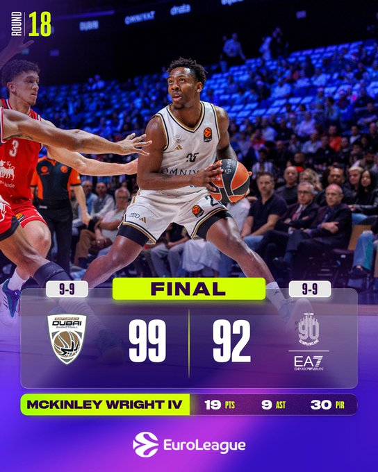 Las defensas dominaron tras el descanso, pero McKinley Wright se aseguró de que Dubái se mantuviera siempre por delante, y los anfitriones disfrutaron de un final relativamente cómodo. Wright lideró la ofensiva de Dubai con estilo con 19 puntos y 9 asistencias, mientras que Bacon fue el máximo anotador con 25. Los pívots Mfiondu Kabengele (17 puntos, 8 rebotes) y Filip Petrusev (13 puntos, 7 rebotes) también causaron impacto en un equipo local que jugó con concentración y control durante todo el partido.