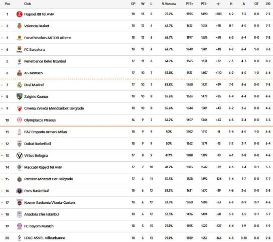 Derrotó en casa al Estrella Roja, en tanto Panathinaikos y el líder Hapoel ganan como visitantes; mientras el colista ASVEL se lleva la victoria en dos prórrogas en casa sobre Anadolu Efes Estambul.