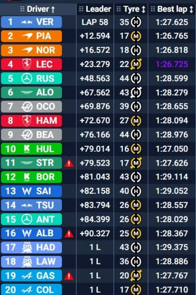 En la vuelta 24, Verstappen se detuvo en ‘boxes’ y dejó la cabeza de carrera a Piastri, que siguió rondando más allá del ecuador de la prueba con neumáticos duros mientras su ritmo caía y permitía al holandés recortarle un segundo por vuelta. La buena noticia para McLaren era que Norris, que había alcanzado el tercer puesto, alejaba a Leclerc.