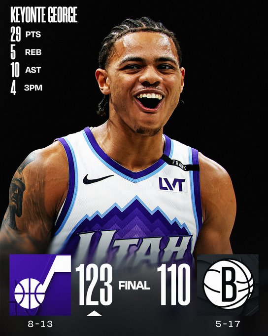 Lauri Markkanen anotó 30 puntos y Keyonte George sumó 29 en un último cuarto demoledor de 42-20. Utah se levantó de un -15 inicial y liquidó el juego con triples consecutivos de George, Filipowski y el propio Markkanen. Los Nets, sin Porter Jr., tuvieron a Clowney con 29 y a Ziaire Williams con 23, pero no pudieron frenar la ráfaga.