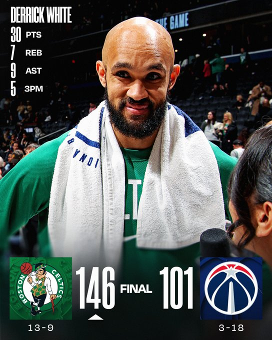 Derrick White brilló con 30 puntos, 9 asistencias y 7 rebotes en una victoria arrolladora, acompañado por los 22 de Jordan Walsh y los 20 de Pritchard. Boston, sin Jaylen Brown, dominó de punta a punta y llegó a sacar 37-4 en el segundo cuarto. Washington tuvo a McCollum con 22, pero cayó a 3-18 tras su derrota más amplia del año.
