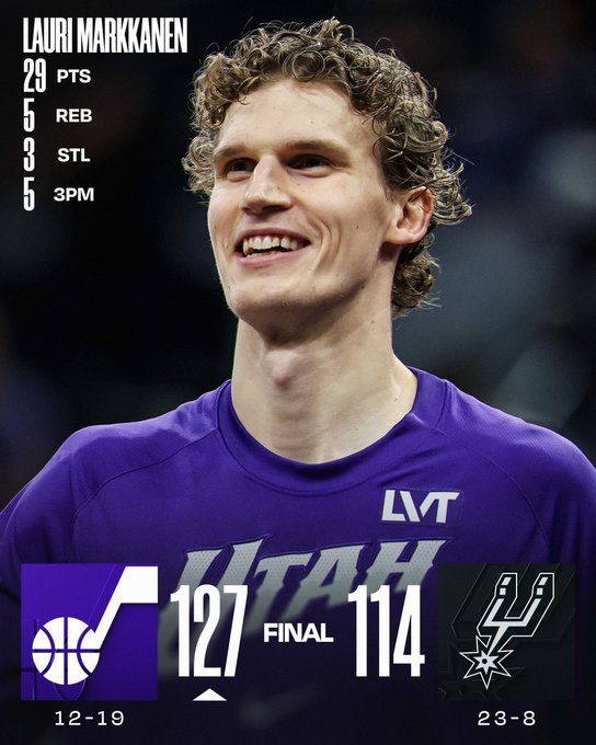 Lauri Markkanen (29) y Keyonte George (28) cortaron la racha de ocho triunfos de los Spurs. Victor Wembanyama volvió como titular con 32 puntos, 7 rebotes y 5 tapas en 27 minutos, empujando una reacción tardía. Utah manejó el partido y se llevó una victoria de peso.