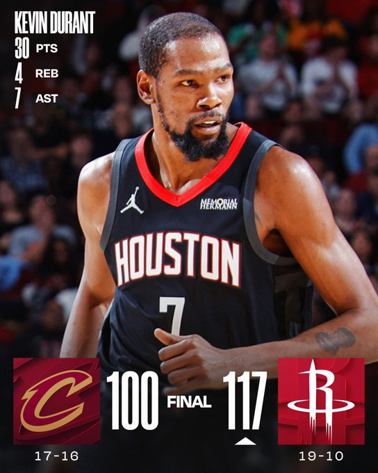 Kevin Durant dominó en tres cuartos con 30 puntos, 7 asistencias y 4 rebotes para un triunfo cómodo. Houston metió una corrida 15-0 en el tercer período y nunca miró atrás. Donovan Mitchell anotó 16 para Cleveland, que volvió a caer fuera de casa.