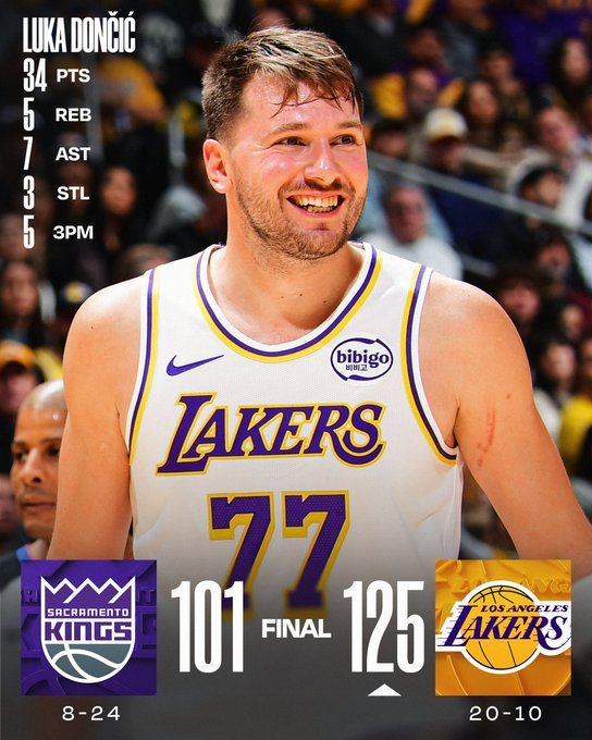 Luka Doncic y LeBron James combinaron 58 puntos para que los Lakers cortaran una racha de tres derrotas consecutivas. Doncic fue el máximo anotador con 34 puntos, incluidos 15 en el segundo cuarto, mientras que LeBron cerró con 24, lanzando 11/13 de campo. Sacramento tuvo a DeMar DeRozan como principal vía ofensiva con 22 tantos, acompañado por 16 de Maxime Raynaud, pero no pudo sostener el ritmo defensivo ante un rival que lanzó 52.8% en tiros de campo.