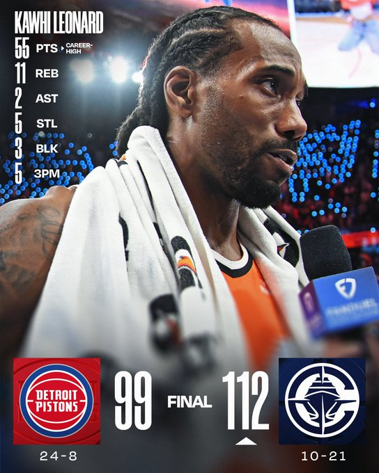 Kawhi Leonard firmó la mejor noche de su carrera con 55 puntos, además de 11 rebotes y 5 robos, liderando a unos Clippers que encadenaron su cuarta victoria consecutiva. El alero lanzó 17/26 de campo, 5/10 en triples y 16/17 en libres, con 26 tantos solo en el tercer cuarto, tramo en el que quebró el partido. James Harden acompañó con 28 puntos. En Detroit, Cade Cunningham terminó con 27 puntos tras un primer tiempo sin anotar y Jalen Duren sumó 18 puntos y 14 rebotes.
