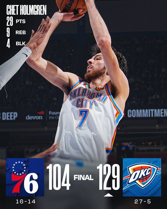 Oklahoma City Thunder venció de manera cómoda a Philadelphia 76ers, como local, por 129 a 104. El mejor del encuentro fue Chet Holmgren, que aportó 29 tantos y 9 rebotes para un OKC que quiere terminar de sacarse el gusto amargo de las derrotas ante los Spurs.