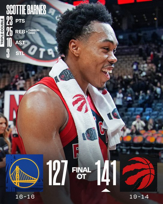 La jornada del domingo arrancó con todo: Toronto Raptors le ganó a Golden State Warriors en tiempo suplementario por 141 a 127. El mejor del encuentro fue Scottie Barnes, con una actuación superlativa de 23 puntos, 25 rebotes y 10 asistencias. Del otro lado, no alcanzaron las 39 unidades de Curry.