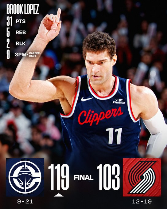 James Harden (34 puntos) y un descomunal Brook Lopez (31 con nueve triples) lideraron la remontada de los Los Angeles Clippers, que dieron vuelta un -12 con un 19-1 en el tercer cuarto y dominaron la segunda mitad frente a los Portland Trail Blazers. Kawhi Leonard sumó 28 y cerró fuerte.