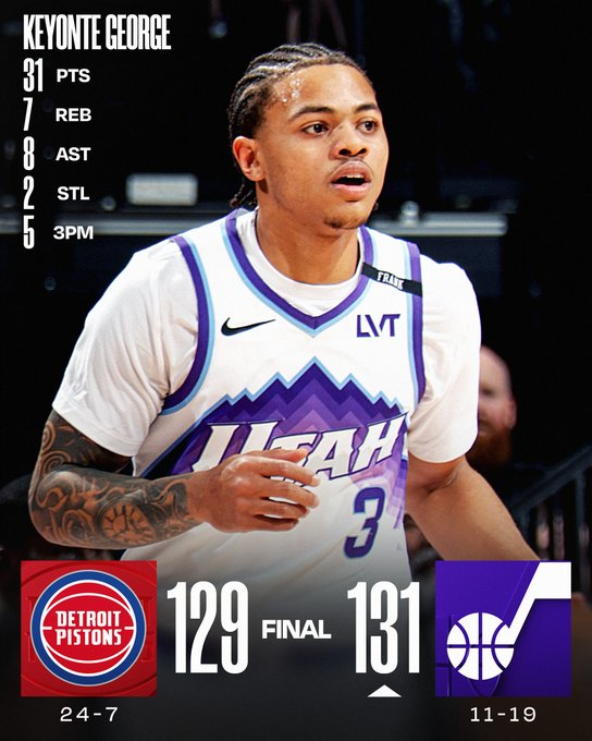 Keyonte George (31 puntos) ganó el partido con una flotadora a 2.1 segundos del final y, junto a Lauri Markkanen (30), sostuvo a los Utah Jazz ante unos Detroit Pistons muy competitivos liderados por un brillante Cade Cunningham (29 y 17 asistencias).