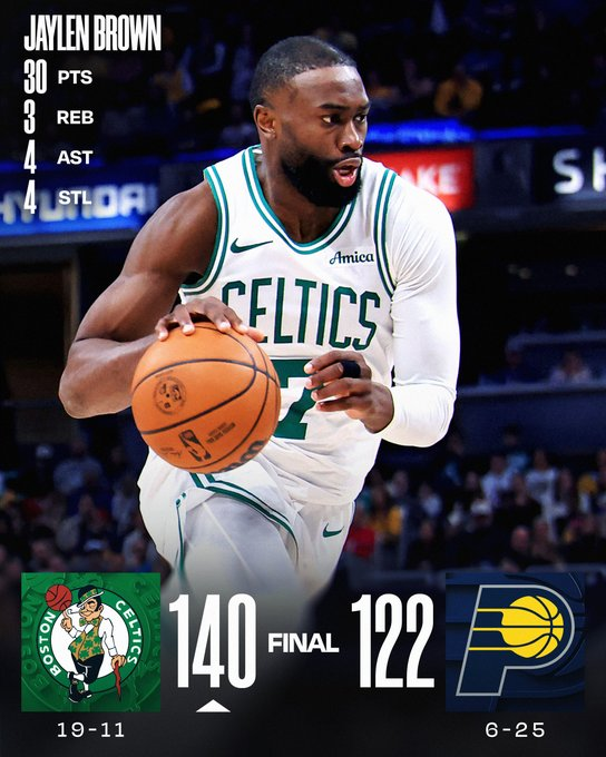 Jaylen Brown (30 puntos) y Sam Hauser desde el banco (23 y 7/8 en triples) encabezaron a unos Boston Celtics que metieron 20 triples y dieron vuelta un inicio adverso ante los Indiana Pacers, apoyados en un segundo cuarto demoledor de 47 puntos. Payton Pritchard sumó 29 en otra victoria sólida.
