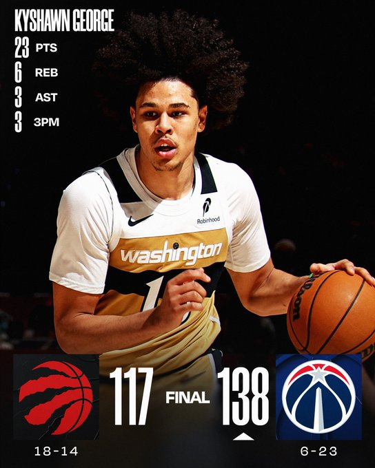 Keyshawn George firmó 23 puntos y los Washington Wizards tuvieron su mejor noche ofensiva de la temporada, tirando casi 60% de campo y cerrando con un 36-17 en el último cuarto ante unos Toronto Raptors disminuidos por lesiones. Brandon Ingram y Immanuel Quickley lideraron a la visita, pero no alcanzó.