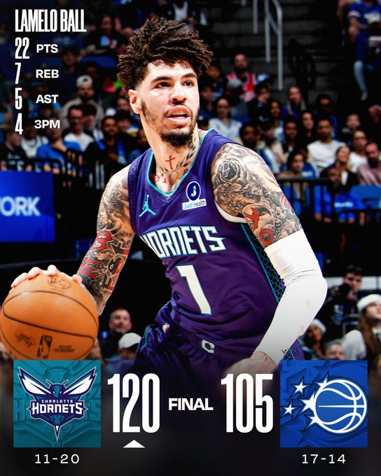 Los Charlotte Hornets ganaron con autoridad en Orlando gracias a 22 puntos de LaMelo Ball y el dominio en los tableros, pese a perder a Kon Knueppel por lesión de tobillo tras un gran inicio. Con 19 triples y clara superioridad física, doblegaron a unos Orlando Magic cortos de figuras y en una racha irregular.
