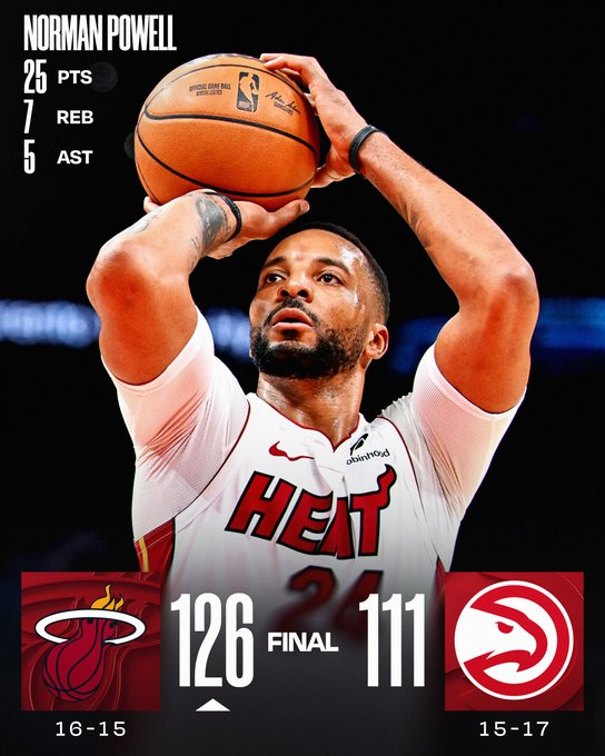 Norman Powell lideró a Miami con 25 puntos y Pelle Larsson aportó 21 en su regreso para que los Miami Heat, pese a las bajas de Bam Adebayo y Tyler Herro, cortaran su mala racha y aprovecharan los 21 balones perdidos de los Atlanta Hawks. Trae Young anotó 30 y Jalen Johnson rozó el triple-doble, pero la diferencia en rebotes y eficacia selló la quinta derrota seguida del local.