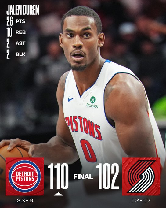 Jalen Duren dominó con 26 puntos y 10 rebotes para sostener a Detroit tras dilapidar una ventaja de 21. Ausar Thompson añadió 18 y 12, y los Pistons cerraron con un 11-2 final. Shaedon Sharpe lideró a Portland con 25, aunque perdió ocho balones; Avdija rozó el triple-doble (18-9-8). Detroit resistió la remontada.