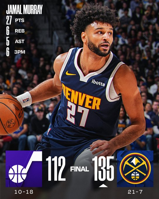 Denver arrancó 19-0 y nunca miró atrás, igualando su récord de triples con 24. Jamal Murray anotó 27 y Nikola Jokic firmó su 14° triple-doble del año (14-13-13). Cameron Johnson metió 20 con 6/6 en triples y Peyton Watson sumó 20. En Utah, Lauri Markkanen llegó a 27 en otra noche cuesta arriba tras un inicio histórico en contra.